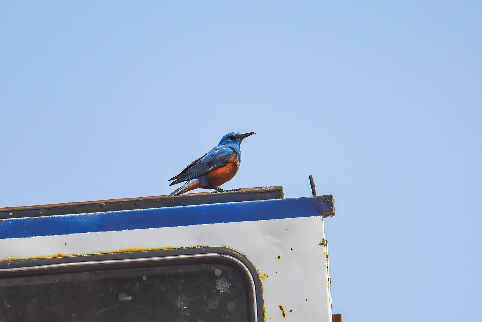 Немного прогулявшись по окрестностям Андреевки, мы отправились в посёлок Хасан, где на болотоходе нас доставили до самого «края трёх границ». Там у гостевого домика меня уже ждал следующий яркий лайфер — синий каменный дрозд дальневосточного подвида с характерной оранжевой майкой.